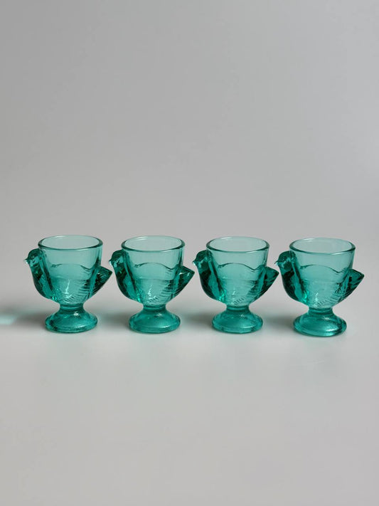 Vintage French Chicken-Shaped Glass Egg Cups (Turquoise/Aqua Blue)