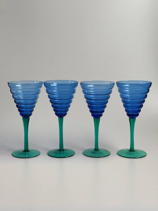 Set of 4 Vintage Blue Ribbed Wine Glasses
