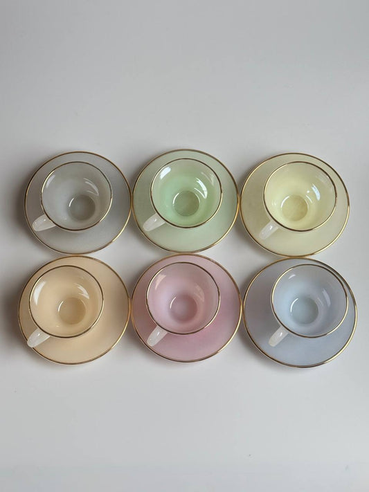 Vintage Arcopal France Harlequin Coffee Cup and Saucer Set | 1960s Pastel Opalescent | Set of 6