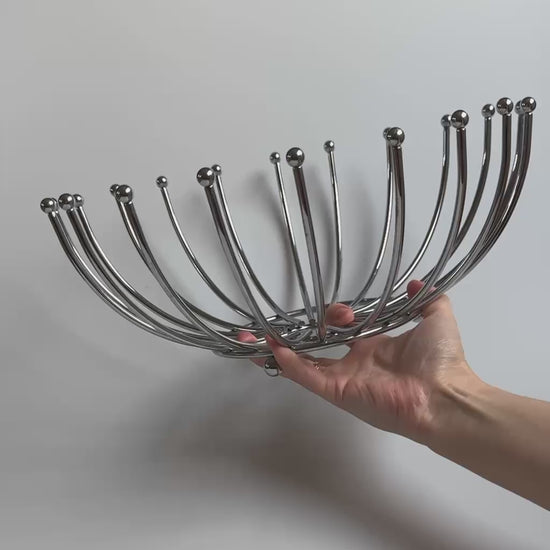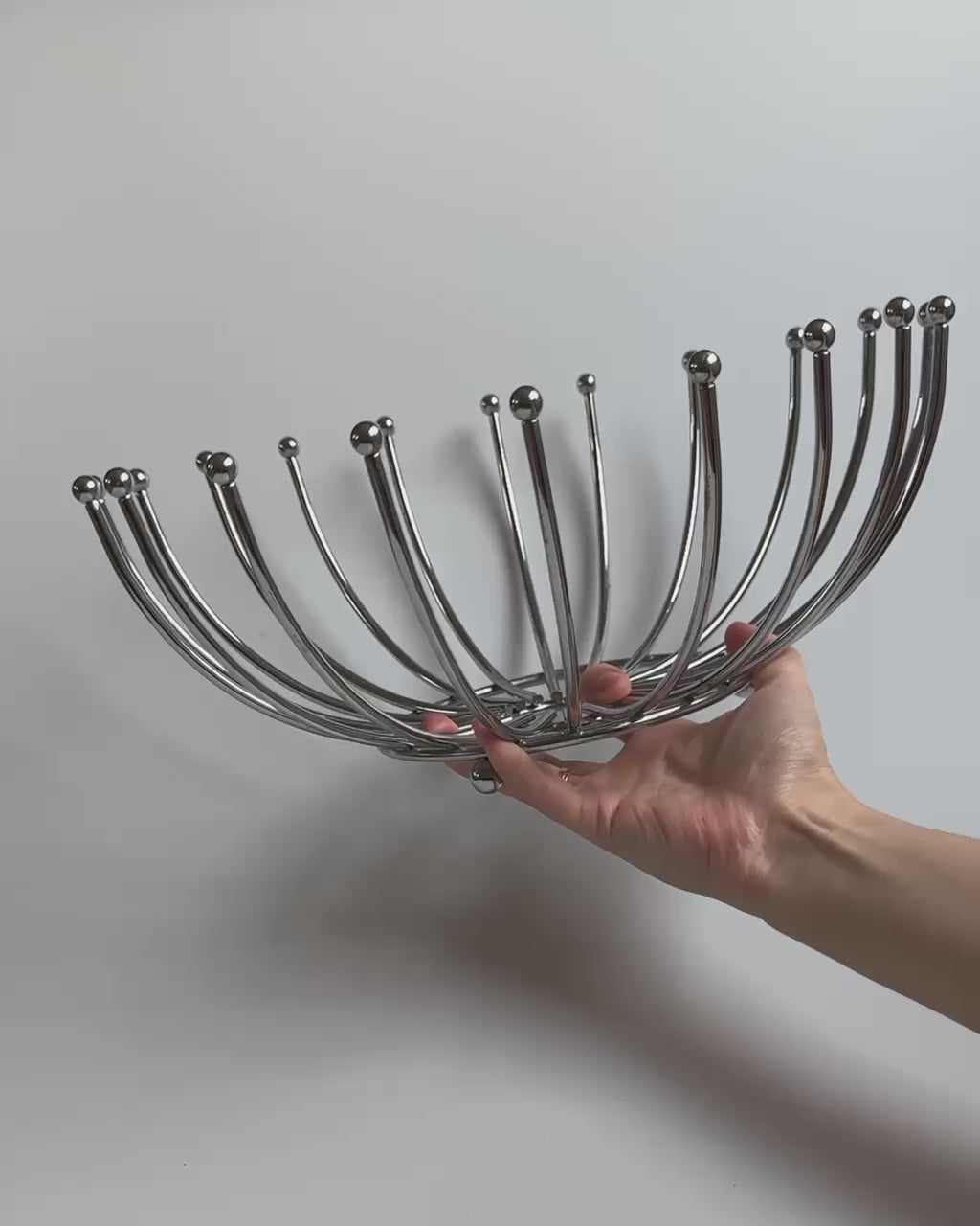 An elegant vintage steel fruit bowl inspired by the Brutalist design of the 1950s. The bowl features a satin finish steel construction with a striking open wire design, creating a stylish centerpiece for your table or kitchen.