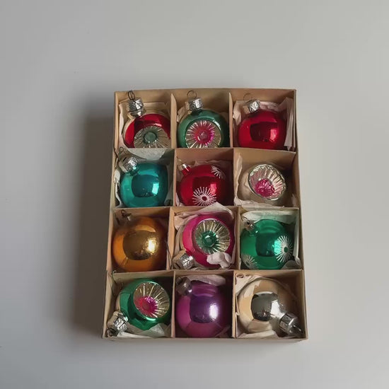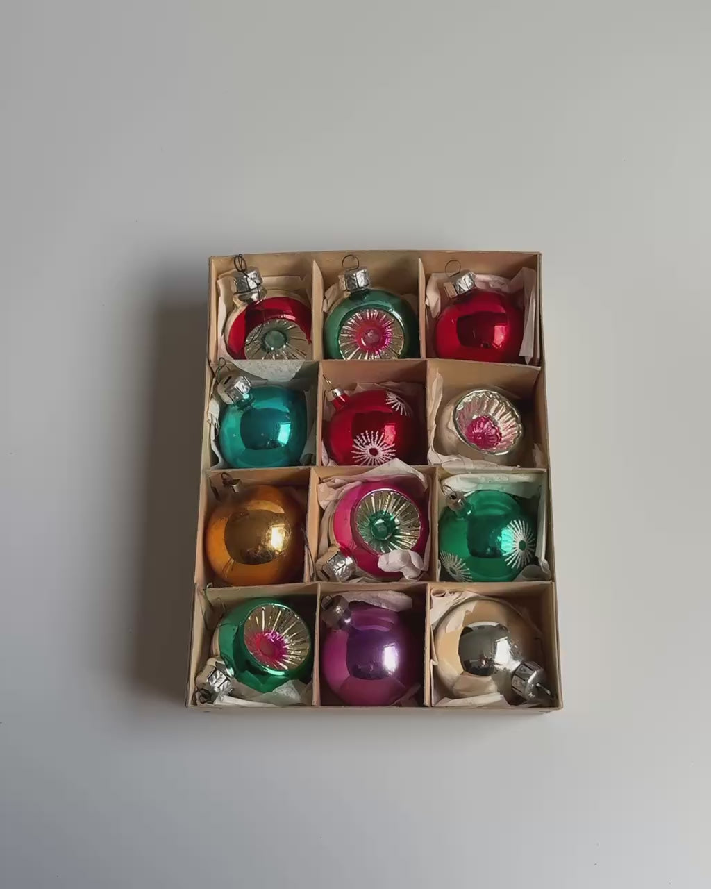The baubles span various eras, with some dating back to the 1940s-50s and others from the 1960s-70s. Please note, while the box is vintage, it is not original to the contents.