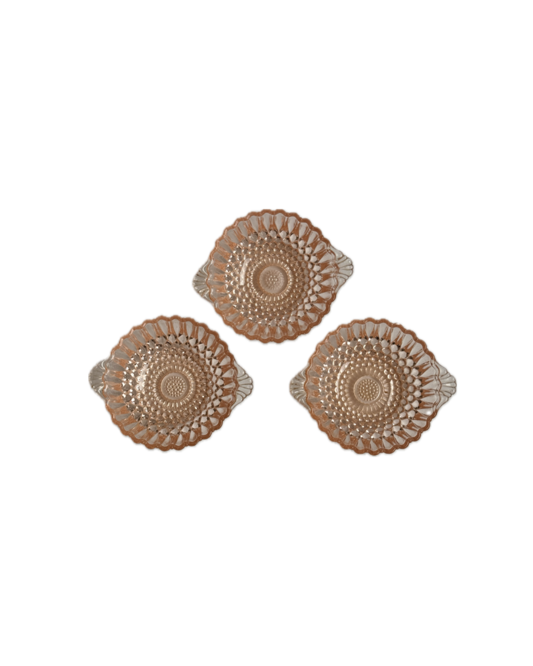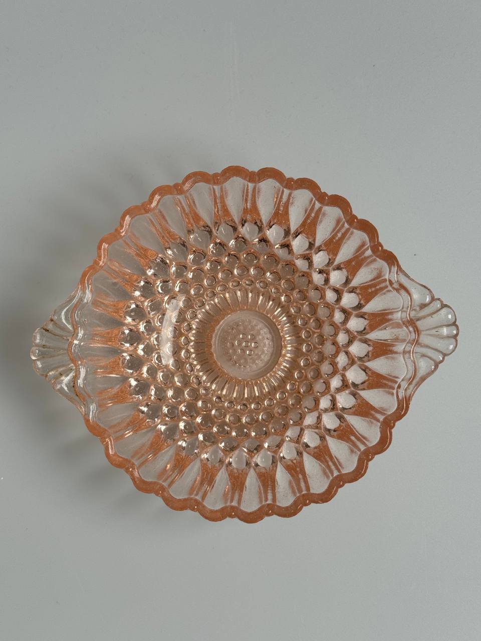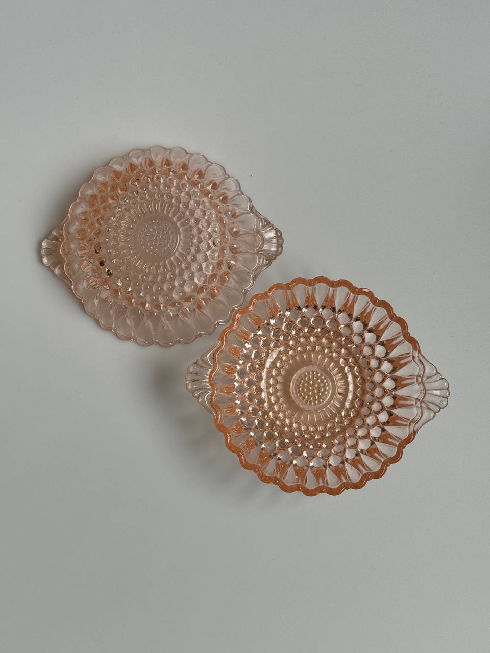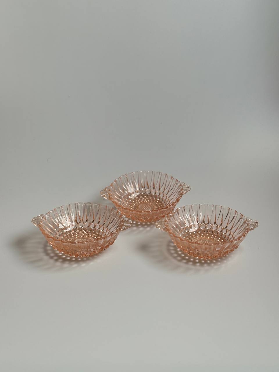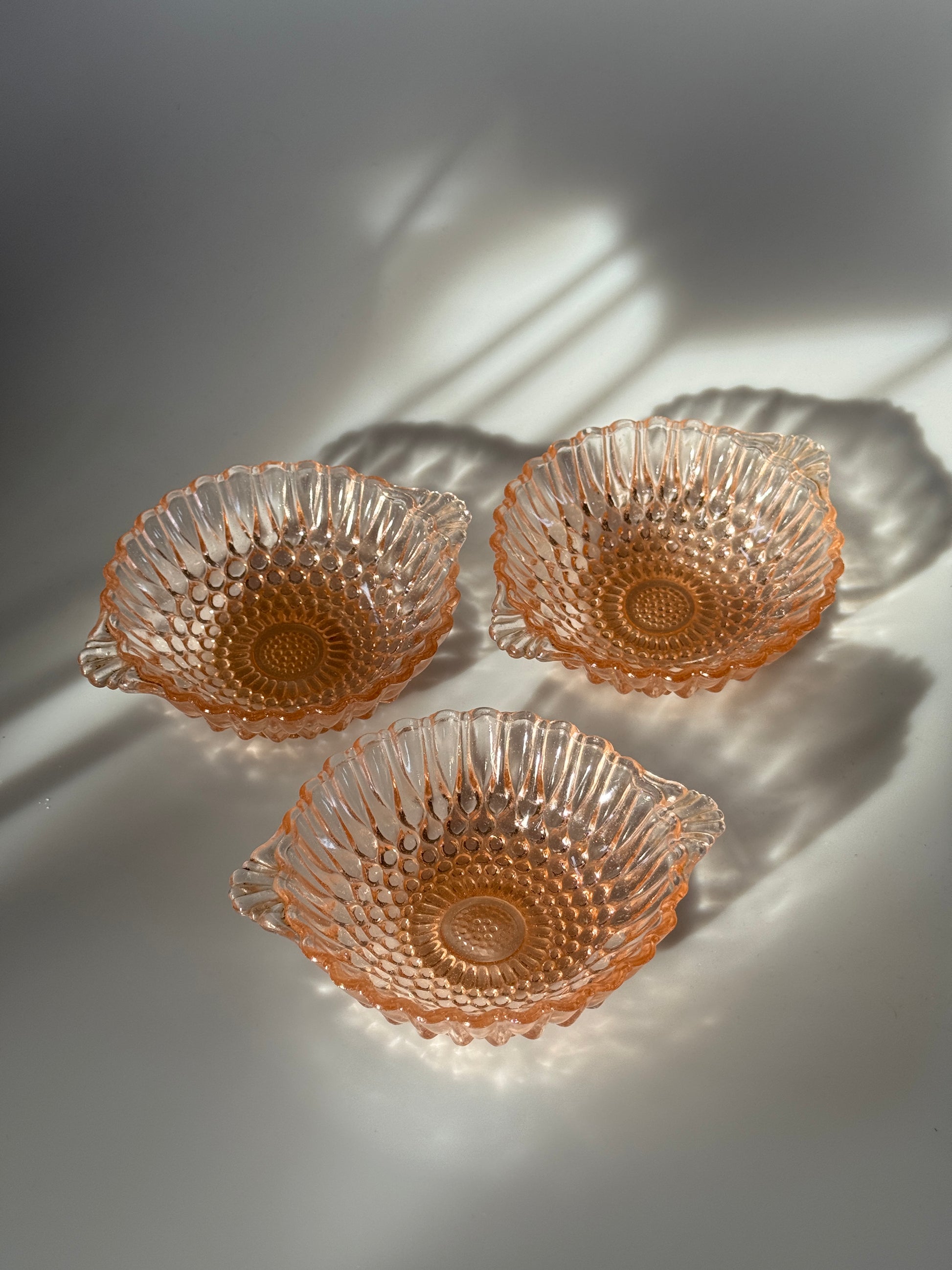 A charming set of three pink pressed glass dessert bowls, perfect for adding a touch of vintage elegance to your dining table or display. Crafted in an Art Deco style, these bowls are a beautiful example of depression glass, showcasing intricate detailing and a timeless design.